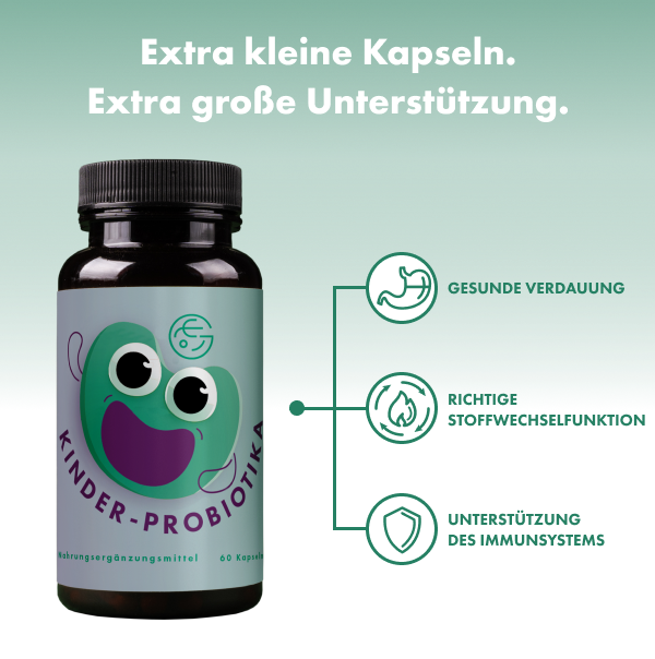Denn wie wir gut wissen, ist ein zufriedener Bauch die Grundvoraussetzung für ein zufriedenes Kind. Verdauungsprobleme können nämlich gerade bei Kindern äußerst unangenehm sein. Mit Hilfe von Probiotika unterstützen Sie die Darmflora und verhelfen Ihrem Kind so zu seiner bestmöglichen gesundheitlichen Verfassung.